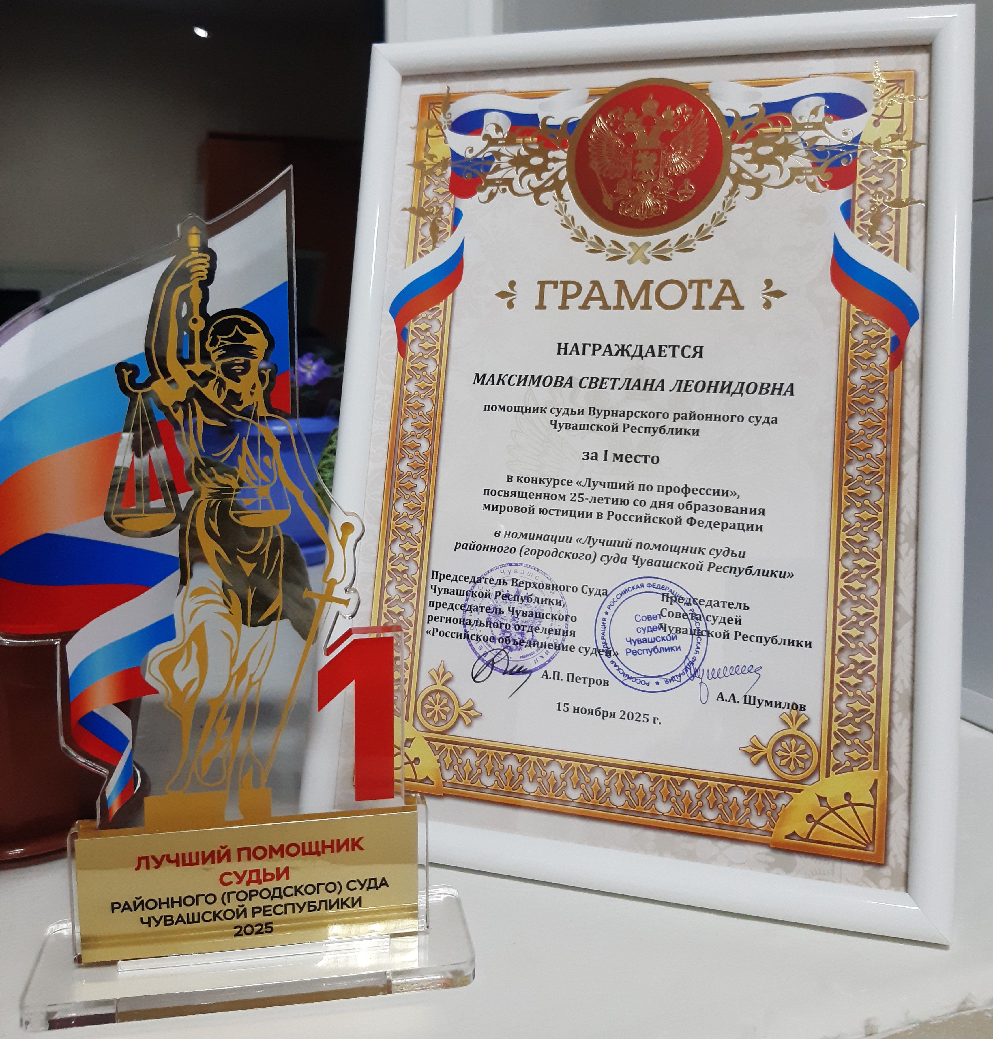 ![]() 15 ноября 2025 года Советом судей Чувашской республики совместно с Чувашским региональным объединением Общероссийской общественной организации "Российское объединение судей" проведен конкурс "Лучший по профессии" среди работников судов республики, приуроченный к 25-летию мировой юстиции. Конкурс проводился в целях реализации эффективной кадровой политики и повышения профессионального уровня федеральных государственных гражданских служащих. В конкурсе приняли участие 32 работника аппаратов Верховного Суда Чувашской Республики, районных (городского) судов Чувашской Республики – Чувашии, мировых судей Чувашской Республики. По результатам оценки конкурсной комиссией помощник судьи Вурнарского районного суда Чувашской Республики – Чувашии Максимова С.Л. заняла 1 место в номинации «Лучший помощник судьи районного (городского) суда Чувашской Республики». Награждение всех участников конкурса «Лучший по профессии» прошло 5 декабря 2025 г. в торжественной обстановке в актовом зале Верховного Суда Чувашской Республики. Коллектив суда поздравляет Светлану Леонидовну с победой в конкурсе и желает ей новых побед, успехов на государственной службе и карьерного роста!!! |